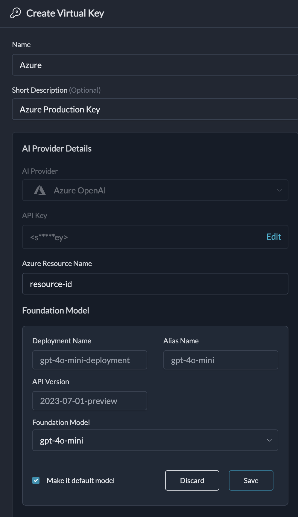 azure-prod-useast). - Credentials: Securely enter your API keys or other authentication details. These are encrypted and will not be visible after saving.
